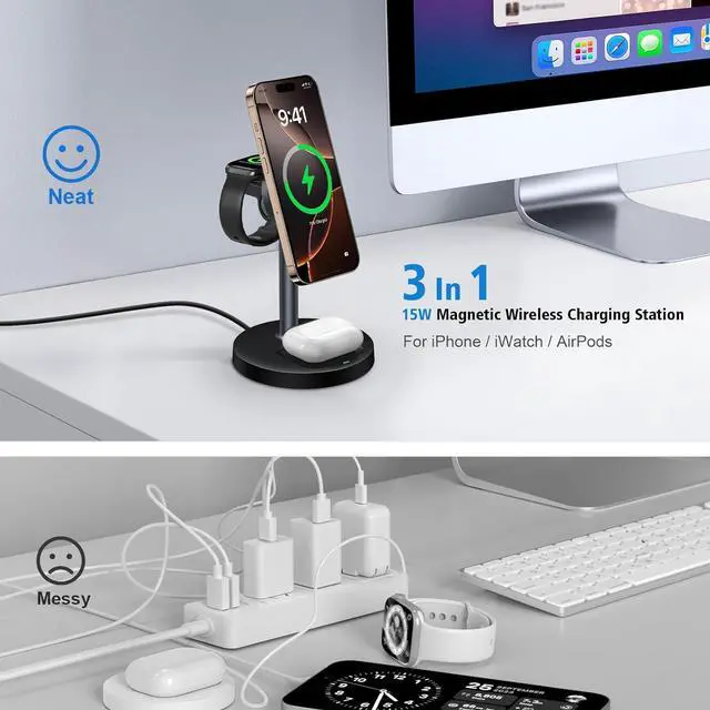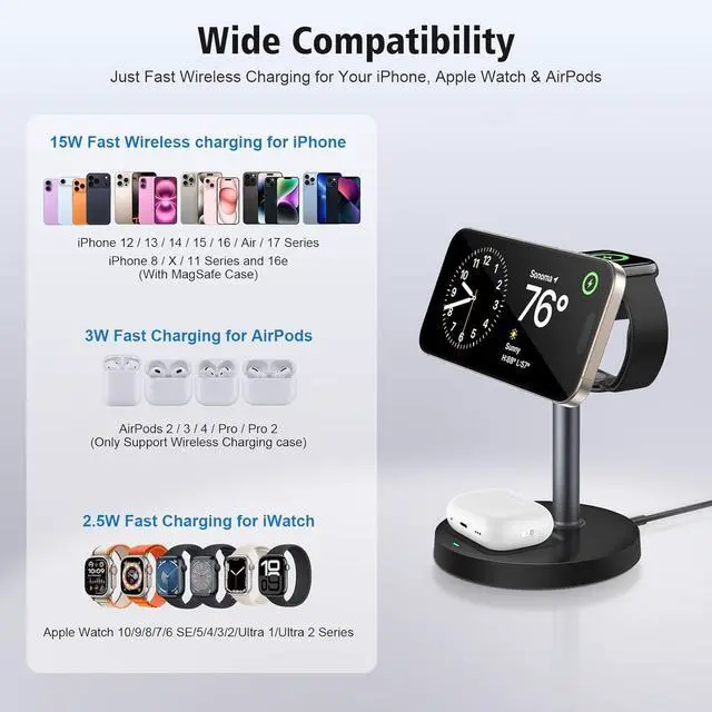 Wide Compatibility for Apple Ecosystem: Designed for Apple users, this 3-in-1 charging dock works with: iPhone 17/Air/17 Pro/17 Pro Max, 16/16 Plus/16 Pro/16 Pro Max/16e, 15/15 Plus/15 Pro/15 Pro Max, 14/14 Plus/14 Pro/14 Pro Max, 13/13 Mini/13 Pro/13 Pro Max, 12 Series, 11 Series, X/XS/XS Max/XR, 8/8 Plus. Apple Watch Ultra 2/Ultra 1/10/9/8/7/6/5/4/3/2/SE. AirPods Pro 2/Pro/4/3/2 (wireless charging case required; not compatible with A3058, A2897, A1602 cases).