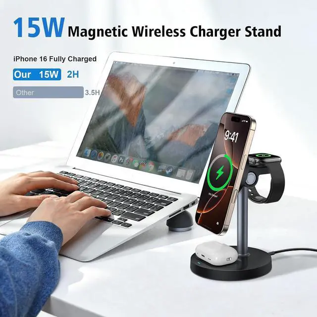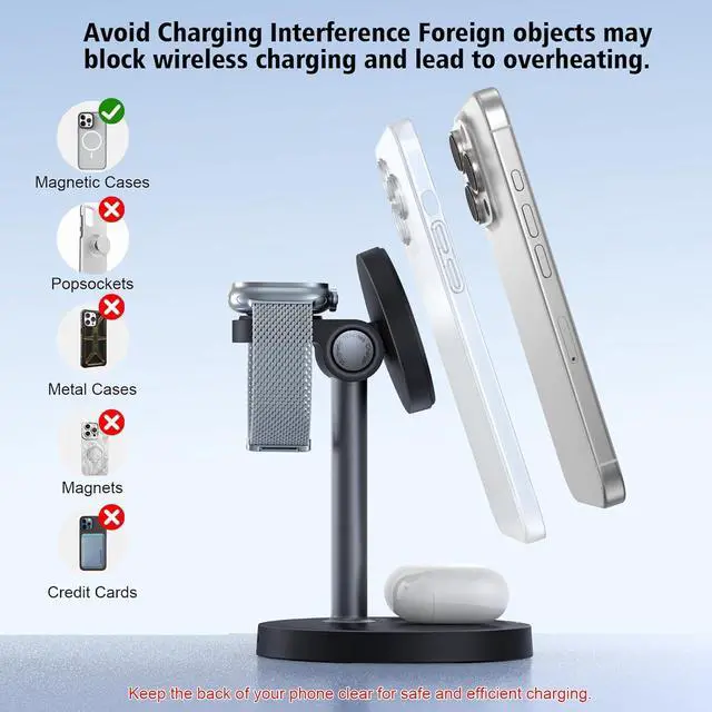 Apple Devices: Charge your iPhone, Apple Watch, and AirPods all at once with this sleek 3-in-1 magnetic charging station. It supports 15W fast charging and powers your phone in just 23 hours. The strong magnetic alignment keeps your iPhone securely in place while charging. (Note: not compatible with phone cases thicker than 5mm/ 0.2 in. )