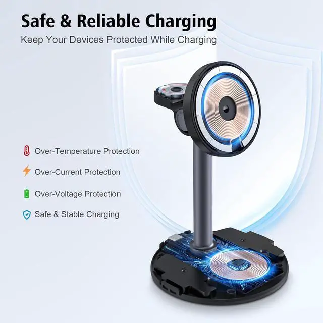 Adjustable & Hands-Free Wireless Charger: Perfect for your nightstand, office desk, or kitchen counter, this stand lets you charge while watching movies, hopping on video calls, or playing games. The 60° vertical tilt and 360° rotation make it easy to find the perfect viewing angle. Its minimalist, all-in-one design keeps your space clean and stylish.
