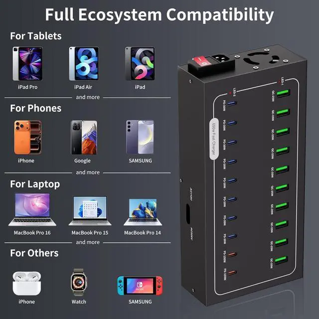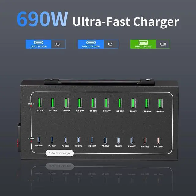 690W USB C Fast ChargerPower your devices effortlessly with our 20-Port Super Fast USB Charging Station, combining 10 USB-C PD ports and 10 USB-A QC 3.0 ports. Delivering 690W total output, this beast simultaneously charges laptop, tablets, phone, earbuds, smartwatches and 18+ other devices without breaking a sweat