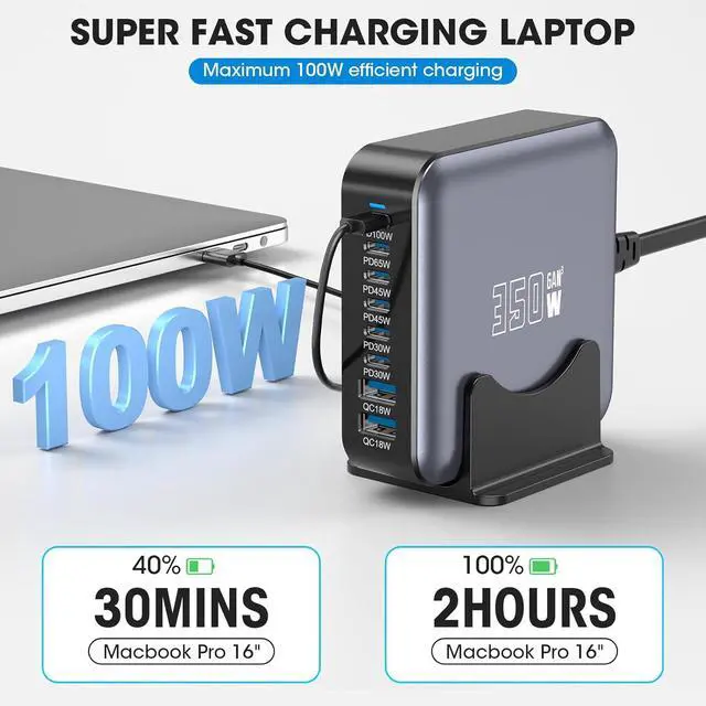 Efficient PD 100W Laptop Charging Station Nowadays, we have more and more electronic devices and need to charge them frequently. The ultra-fast PD port with a maximum of 100W can upgrade your MacBook Pro 16-inch to 45% in just 30 minutes. Whether you are in a library, conference room, or coffee shop with limited space or shared space. When you go out for work or travel, just bring this small charger to quickly charge all your devices.