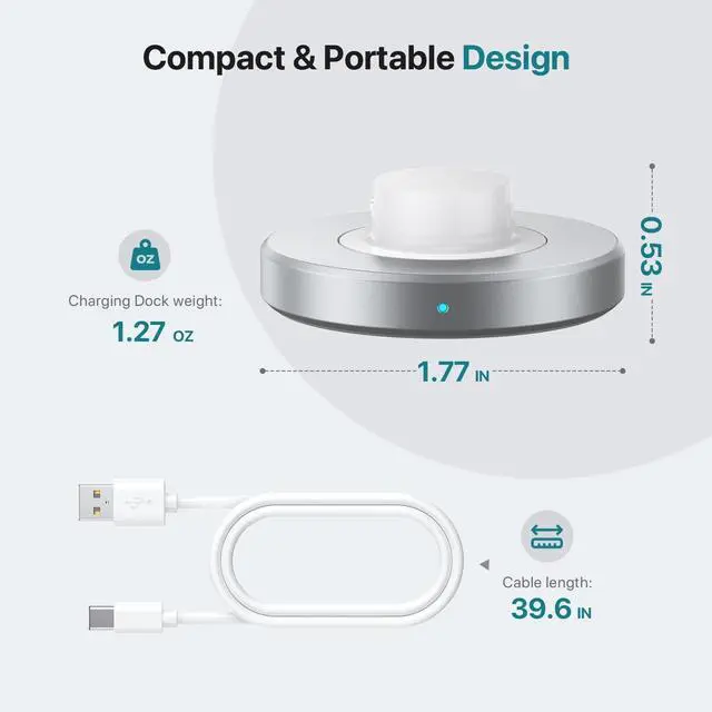 Lightweight and Anti-slip Base Design: This aluminum alloy charger has a diameter of ( 1.77 " )and a weight of ( 1.27 oz). It is equipped with 3.3 FT USB-C charging cable. The base is made of silicone with an anti-slip design to prevent sliding, allowing for charging at home, in the office or outdoors at any time