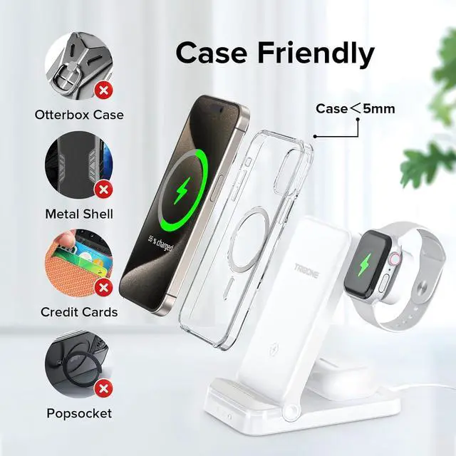Fold Up Charger Station: A charging station for apple devices charging your Airpods, iPhone, and Apple Watch simultaneously. With a built-in wide-range induction coil and wireless charger technology, it brings you an easy and convenient charging experience without the hassle of cluttered wires. It can also charge other phones with wireless charging capabilities.