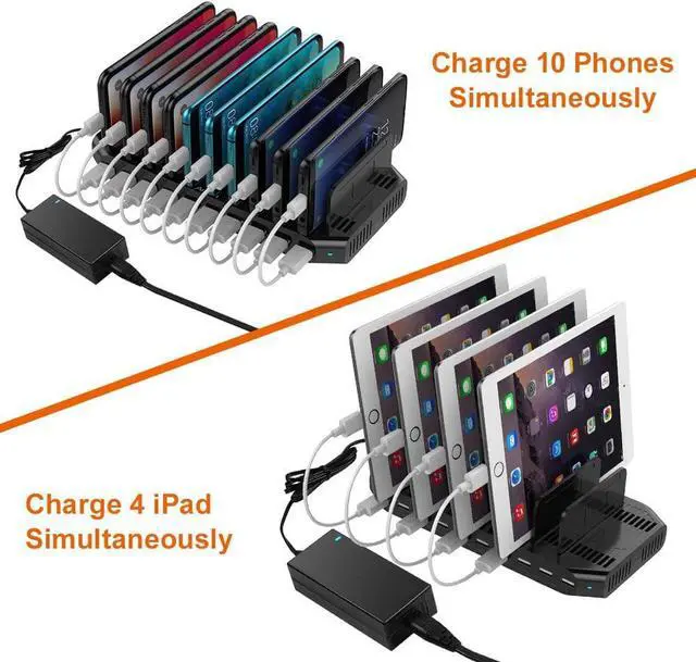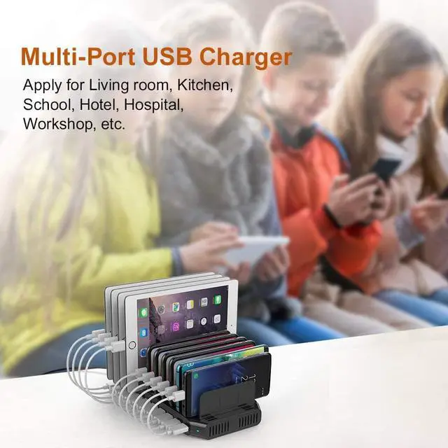 10 Port USB charging station - Charging with 10 devices simultaneously meanwhile each port provides power up to 5V 2.4A. No matter phones or tablet. (Charging Cable NOT included. )
