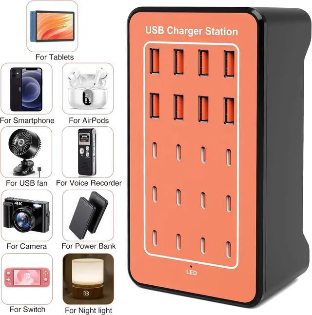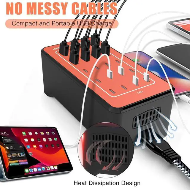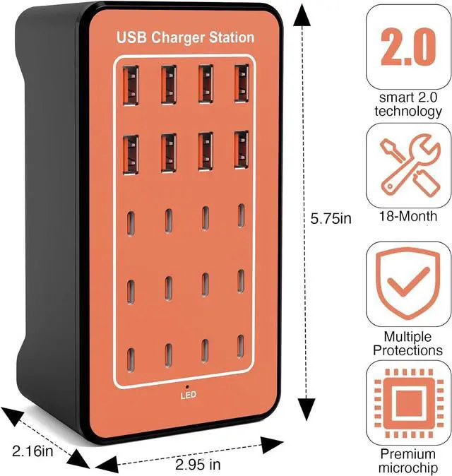 Advanced Charging Technology Support 20 devices simultaneously, charger up to 5V/ 2.4A for single USB port and 5V/3A for single Type-C portEach port of the charging station recognizes the exact current requirements
