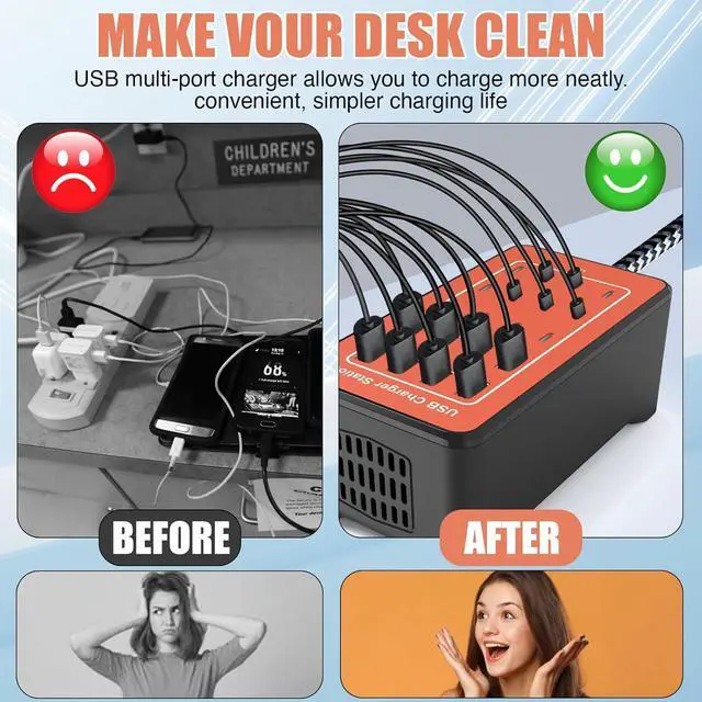 Intelligent Design: Our multi-port USB charger station is designed with intelligence in mind. It automatically detects the current requirements of each device and distributes power accordingly, making charging more efficient and hassle-free. Its compact design makes it perfect for home, school, office, and party use.