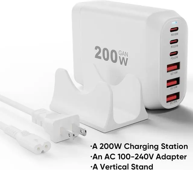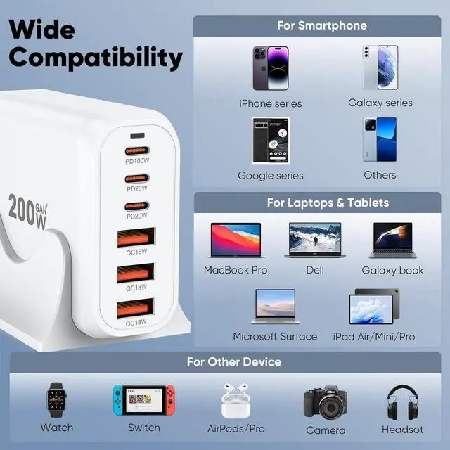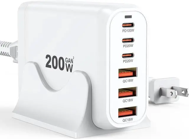 Total 200W Output: There are 3 PD USB C ports and 3 QC USB A ports (6-in-1 Fast Charger), with a total output power of 200W, making it the preferred charger for office and home users. While saving money, it also achieves faster charging speed and higher charging efficiency.
