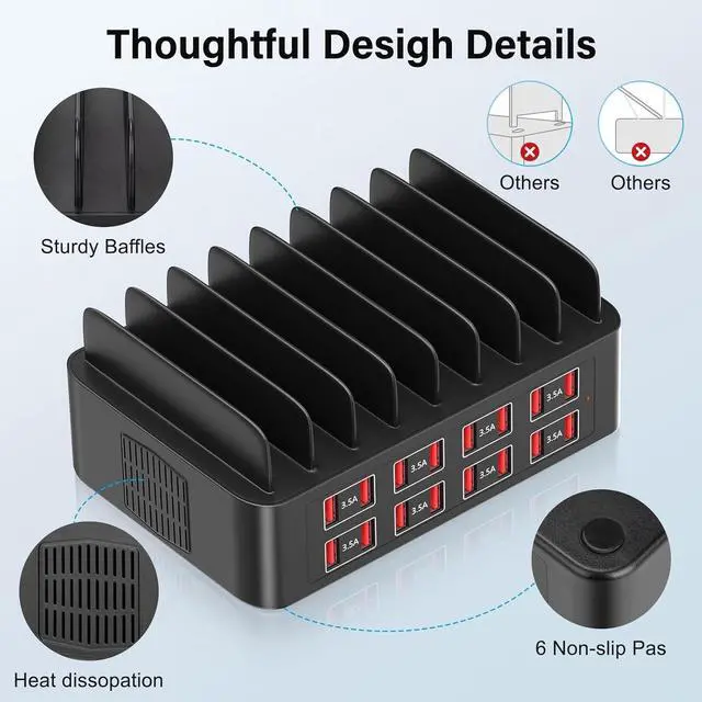 Safe chargingThis usb charger station is made of fireproof material with multiple protection technologies to prevent over-voltage, over-current, overload and short-circuit, two Heat sinks to effectively protect your device, and the bottom is equipped with non-slip pads to keep the charging station from moving around.