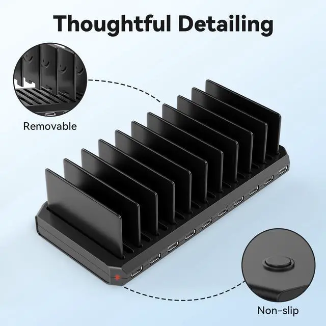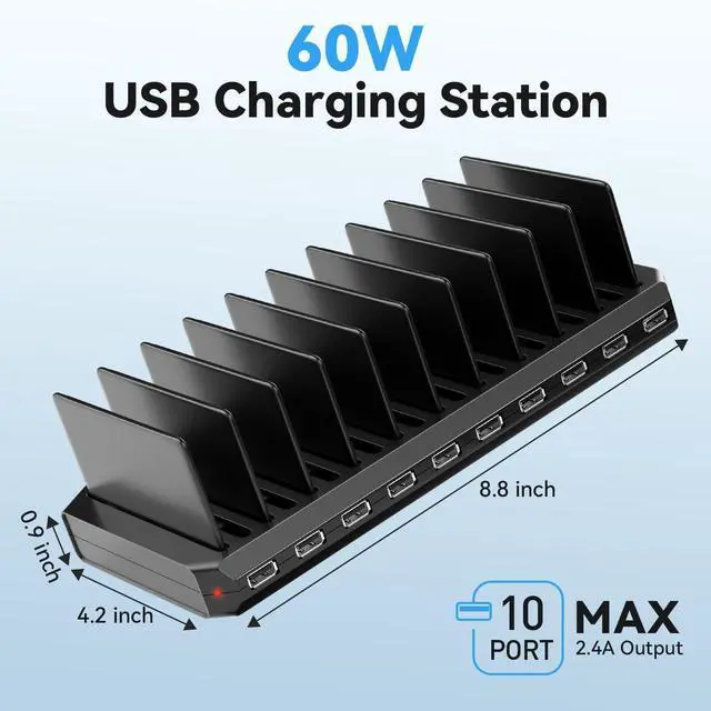 10 in 1 USB Charging StationThe 60W 10-port cell phone charging station can charge up to 10 cell phones or other devices at the same time. Charging is fast and comes with a stand to save time and space.
