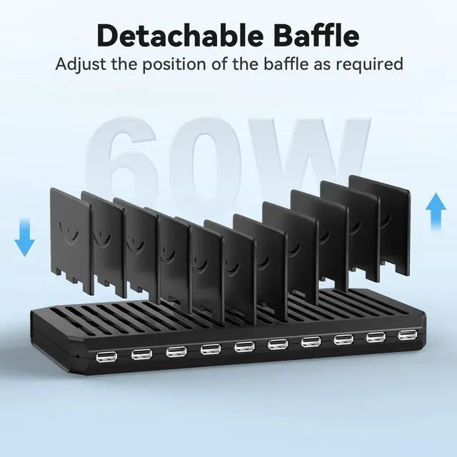 Removable Dividers Design: The cell phone charging station is equipped with 11 removable baffles and you can adjust the distance of the baffles according to your needs. It can save space and flexibly adjust the distance, the design is more humanized.