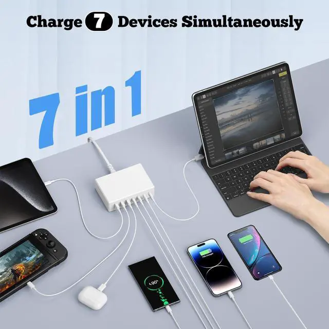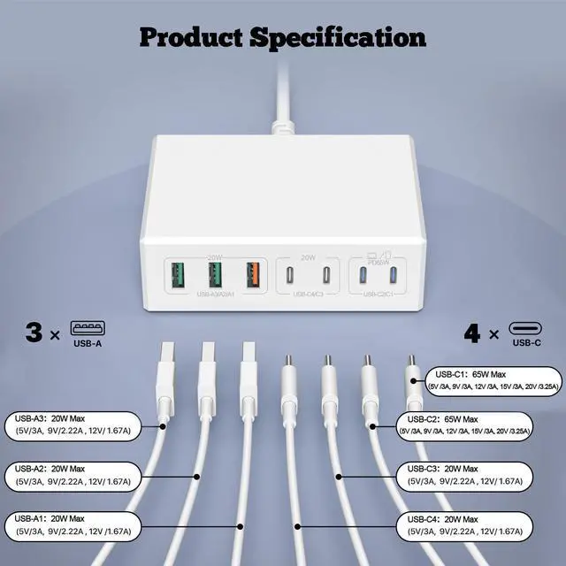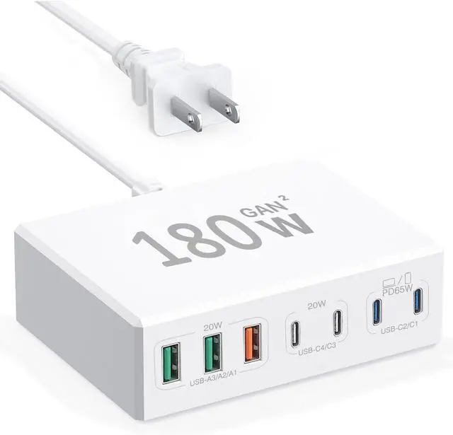 7-port fast chargerPortable 7 USB charger 4 USB C ports (USB-C1/C 2: 65 W), (USB C3/C 4: 20 W)+3 USB-A ports (USB-A1/A2/A 3: 20 W), total up to 180W (compatible with almost all smartphones/laptop/tablet/watch/earphone/Power Bank/Electric Fan) Fast and safe charging, meets the various needs of users.