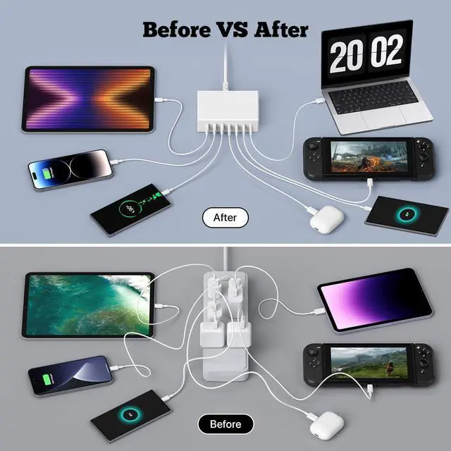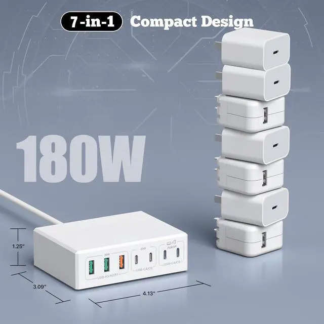 180W High-Speed ChargingThe USB-C1/C2 port supports a maximum output power of 65W. Our USB C Charger can simultaneously charge 7 devices at lightning speed, from smartphones to tablets to USB-C laptops. charge at lightning speed, The USB C fast charger automatically detects the connected devices and charges them to the optimal level. to minimize waiting times and free you from messy chargers with different interfaces.