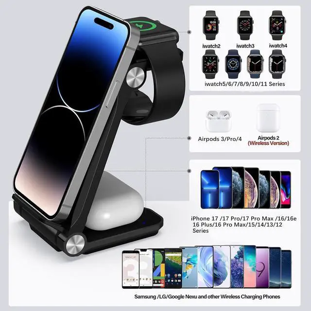 HIGHLY COMPATIBLE: Perfect 3 in 1 charging dock for Apple, Compatible with iPhone 16e/16/16 Plus/16Pro/16 Pro max15/15 Plus/15Pro/15 Pro max/14/14 Plus/14Pro/14 Pro max/13/13Pro/13Pro Max/13 mini/12/12Pro/12Pro Max/12 mini/11/11Pro/11Pro Max/XS/XR/XS MAX/X/8/ 8Plus & Apple iWatch 10/9/8/7/6/5/4/3/2/SE/Ultra & AirPods Pro2/Pro/4/3/2.. Also charge Samsung Qi-enabled smartphones and any other wireless charging function phones and earbuds (BUT watch part is only for Apple)