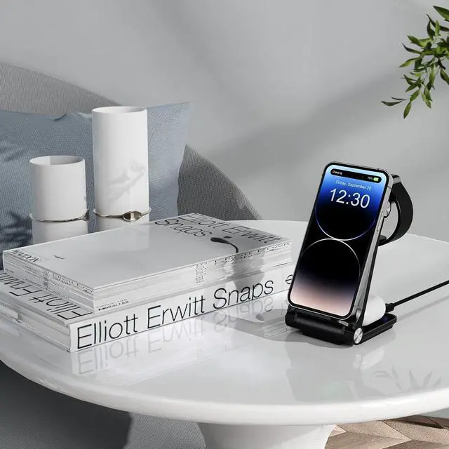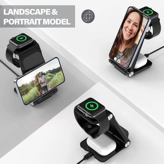 WIRELESS CHARGING STATION: Unlike other multiple wireless charger station who ask you install your own Watch charger, this charger stand is a TRUE 3 in 1 wireless charging that has iWatch charger built in, just put all your devices then charging start, support charge iPhone, Airpods and Apple watch simultaneously. (Apple Watch system update to at least OS 8.0 or above)