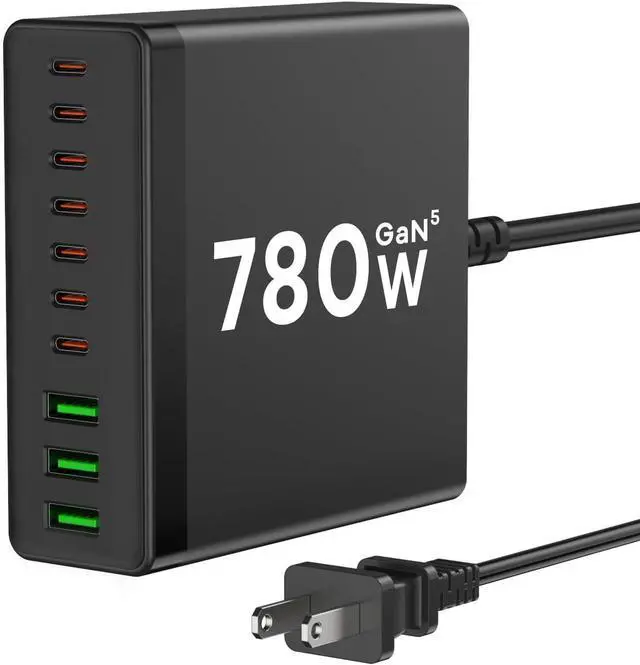 USB C Charger Block: 780W usb c charger with 7 usb-c and 3 usb-a power transfer ports. There are 120*3 usb c, 100W*2 usb c and 65W*3 usb c. These can charge your 7 laptops or tablets at the same time, up to 10 devices without waiting. Each port intelligently distributes power to ensure you get the best charging efficiency.