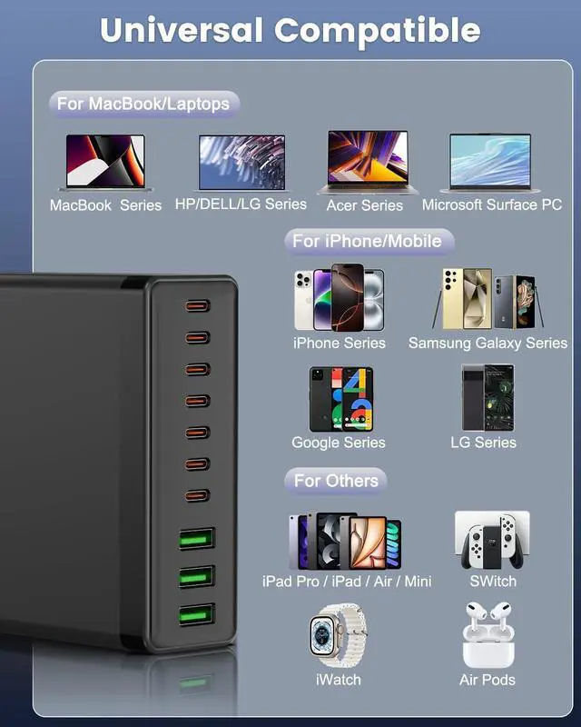 USB C Charger Block Compatibility - 7 usb c and 3 usb a ports can power multiple devices at the same time. It is suitable for charging almost all tablets, laptops, smartphones and various USB smart devices. It is compatible with MacBook Pro 16-inch, 14-inch, 13-inch, compatible with iPhone 16, 15 Pro/14 Pro Max/13/12, Switch, Samsung Galaxy S23 Ultra/S22 and more.