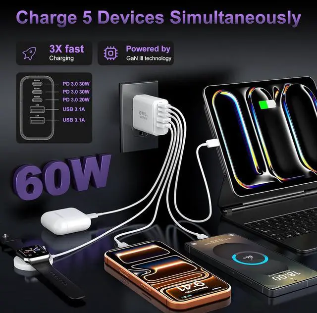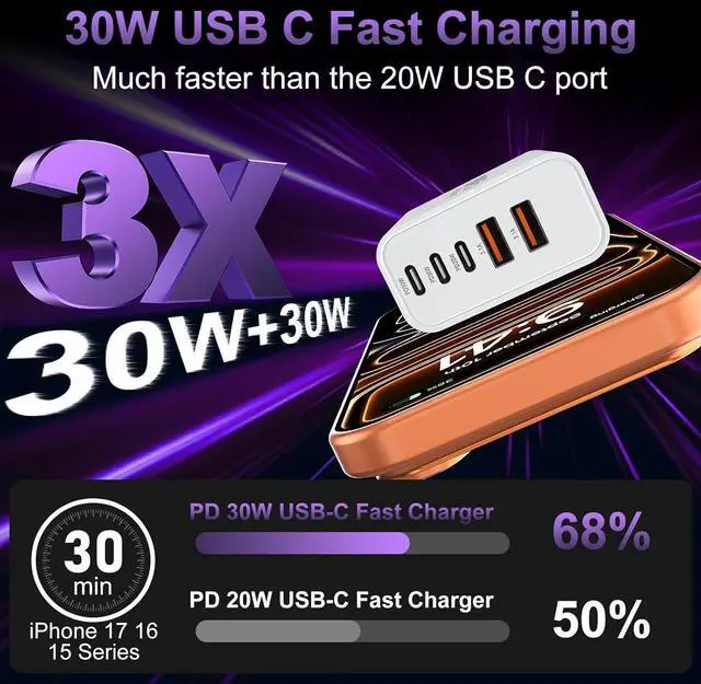 2-Pack 60W USB C Charger Fast Charging Blocks: Auorld 60W USB C Fast Charging Blocks support the Power Delivery and Quick Charge 3.0 fast charging functions with a total power of up to 60W(when charging for multi devices, it will be split between several USB ports). The USB-A port offers an output power of 3.1 A/5 V, while each USB-C port provides Max 30W output power, charge your iPhone 16 15 Pro Max up to 65% in just 30mins, 10% faster than the original 20W USB C charger