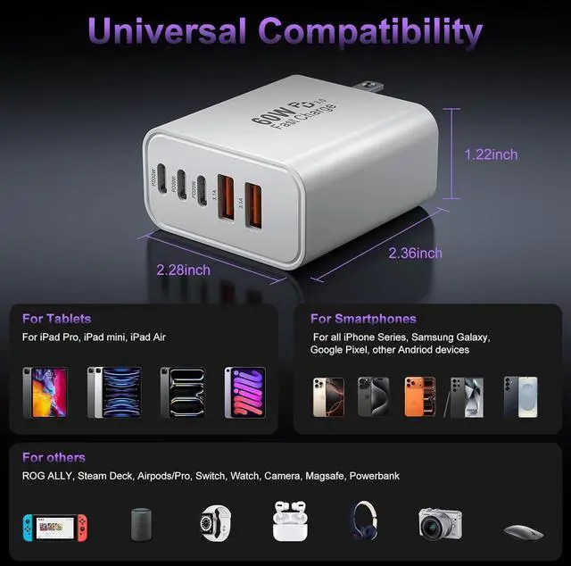 Compact and Portable Phone Charger Brick: Designed with the pocket-friendly compact body and 5-port charging adapter, the USB C box is integrated to charge multiple devices at home, office and travel. Small size saves you space and fits perfectly into pockets, handbags, travel cases. Packaged with dual 60W 5-port usb c wall chargers (cable not included). If you have any problems with the c type charger block, please contact us
