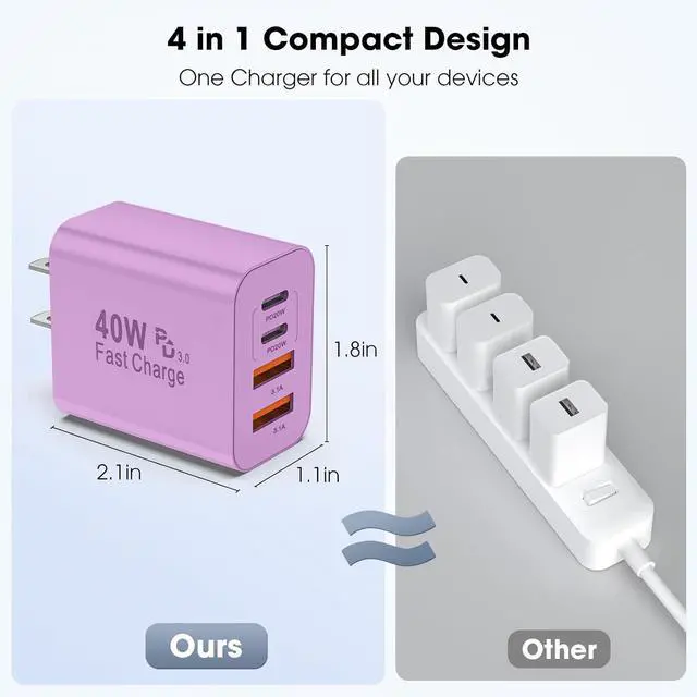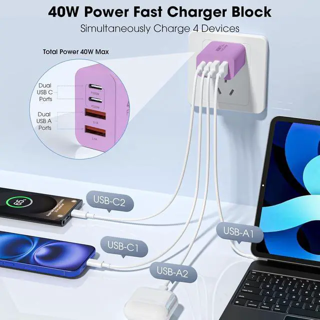 4-Port USB C Charging Block DesignFeatures both a Type C charging block (for modern devices) and legacy USB-A port. The perfect fast charger block solution for simultaneously powering your iPhone 16 and iPad/MacBook with optimal speed.