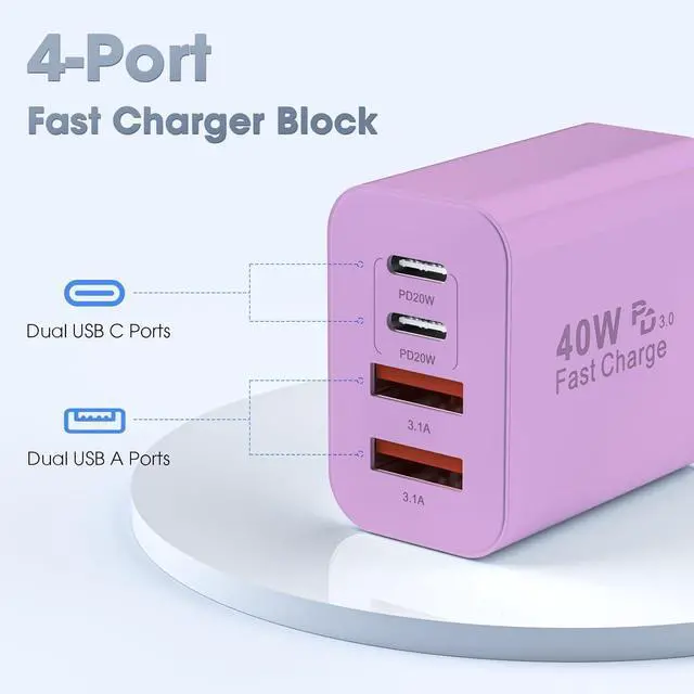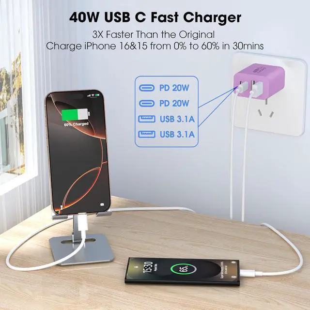 USB C Charger Block This USB C wall charger delivers true fast charging block performance with 40W PD 3.0 (USB-C) + 40W QC 4.0 (USB-A). Charges your iPhone 16/15 Pro Max to 60% in just 30 minutes - 3x faster than standard Apple charging blocks.