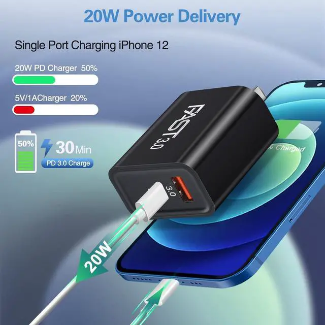 Fast Charger: USB C Port could fast charge your iPhone 13 from 0 - 50% in just 30 minutes, efficient charging up to 3X faster than a 5W original charger. USB-C port achieves PD 20W and USB-A port 18W when only one port is working.