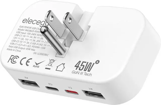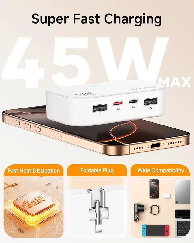 GaN High Speed Fast Charger Block: PD 45W USB C wall charger has dual USB and dual USB C ports, and allows you to charge 4 devices simultaneously. GaN III chip technology makes your device' s output charging always in at maximum speed. Total output is up to 45W, which is 80% faster than the other USB C adapter. It delivers fast and stable power at high efficiency to minimize energy loss; enhanced heat dissipation keeps it cool for device protection