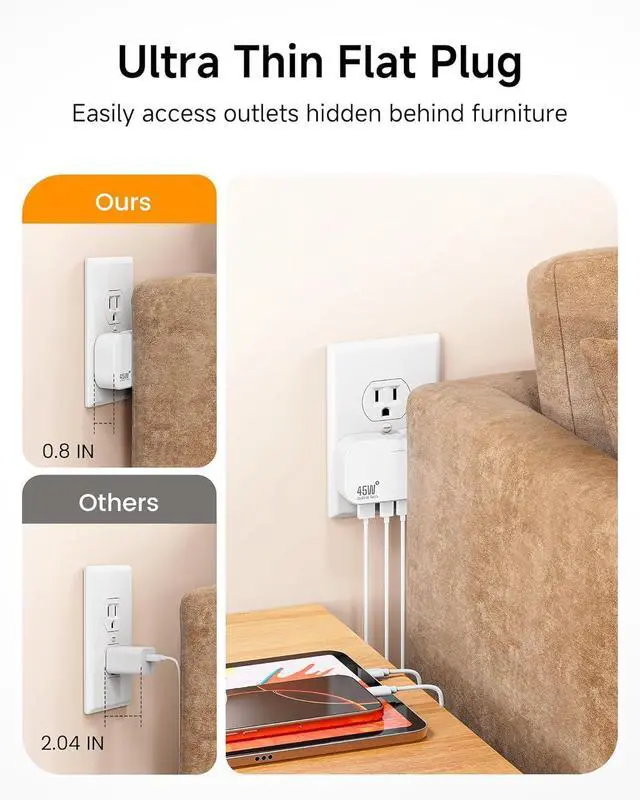 Slim Flat Wall Charger: The foldable flat USB wall plug can easily fits into your pocket or bag, saving space and enhancing portability( 3.5 *2* 0.8 in 3.4 oz). This multi USB C charging station is flat and not bulky like other USB wall charger. USB flat plug offers a slim design that allows you to easily access hard to reach outlets that are behind furniture or other tight spaces. Whether you' re at home, in the office, or traveling, this charger is your perfect companion