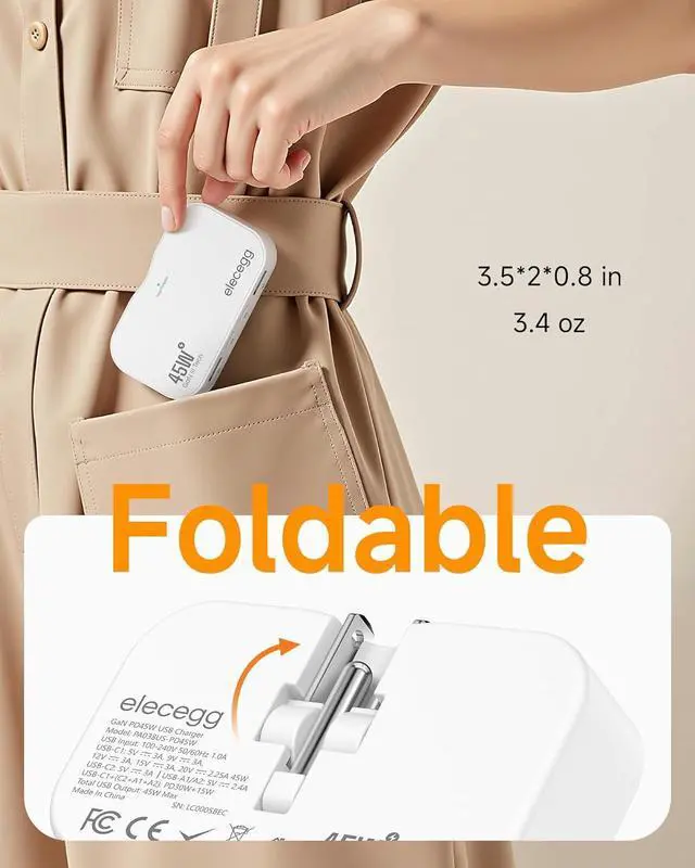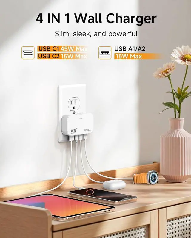 Wide Compatibility: The slim USB C plug adapter is compatible with almost all electronic devices, charging adapter for iPhone 17/16/15/14/13 Series, Samsung Galaxy S Series, Tablets, Airpods, Nintendo Switch, lamps, speakers, fans and more. The foldable charger can be easily converted into a 2 prong or 3 prong charger. It can be used in standard outlet, decor outlet, USB receptacl, GFCI outlet and other outlets