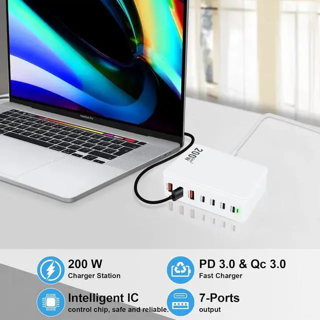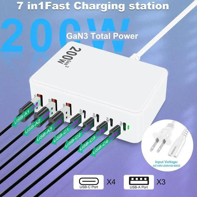 USB C Charger: This usb c charger block provides 7 charging wattage options with 4 USB-C ports and 3 USB-A ports. Such a usb c multiport charger can handle all your devices at fast speed with a total output up to 200W. What' s cool is that you can charge two laptops with our top two usb c ports of 45w.