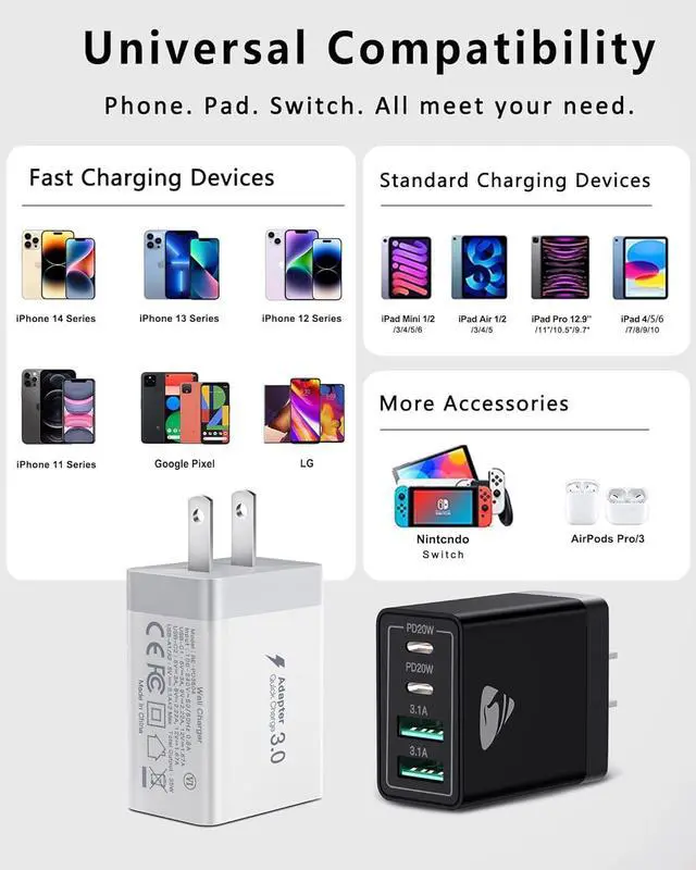 High-Speed Charging: The usb wall charger supports the Power Delivery and Quick Charge 3.0 fast charging functions with a total power of up to 40W. The USB-C port supports a maximum power output of 20W. Charge your iPhone devices from 0% to 58% in just 30 minutes. That' s up to 3X faster than an original 5W charger block