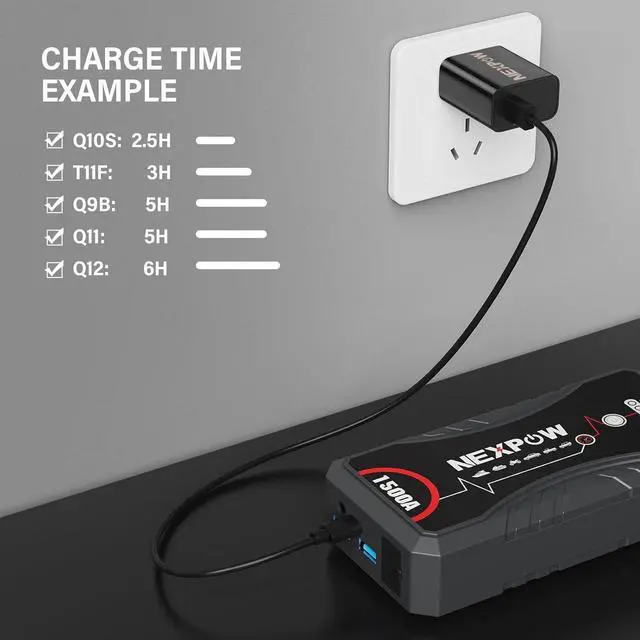 Charging the NEXPOW Jump StarterFit for all NEXPOW jump starters including Q11/Q12/Q10S/Q9B/T11/G17.