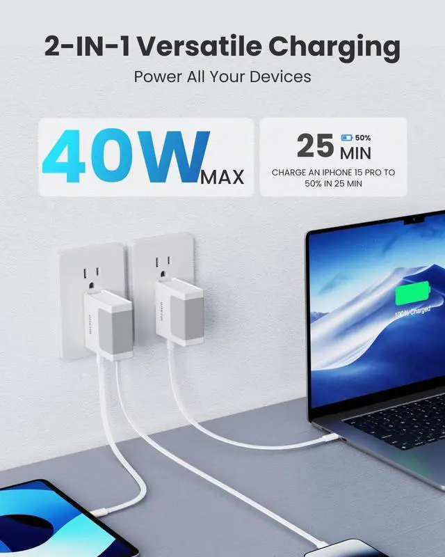 40w Fast Charging for 2 Devices: The retractable phone charger is capable of supporting up to 40W of fast charging and can charge an iPhone from 0% to 50% in just 25 minutes. It features an additional USB-C port, allowing users to simultaneously charge their MacBook and iPhone. When two devices are connected, the charger efficiently distributes power to ensure optimal charging and minimize waiting time.