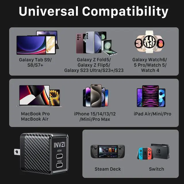 Universal Compatibility: The INVZI GaNHub 45W is a versatile charger compatible with a wide array of devices, including MacBook Air, iPad Pro, iPhone 15/14/13/12 series, Samsung S24/S23 and more. It ensures your devices stay powered, from smartphones to laptops and beyond.