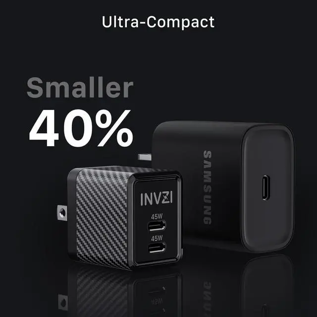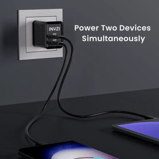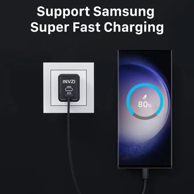 Cutting-Edge GaN Technology: INVZI GaNHub 45W advanced GaN technology ensures this compact charger delivers powerful and fast charging, specifically optimized for a wide range of devices, from the latest Samsung Galaxy S24 Ultra to the iPhone 15 Pro.