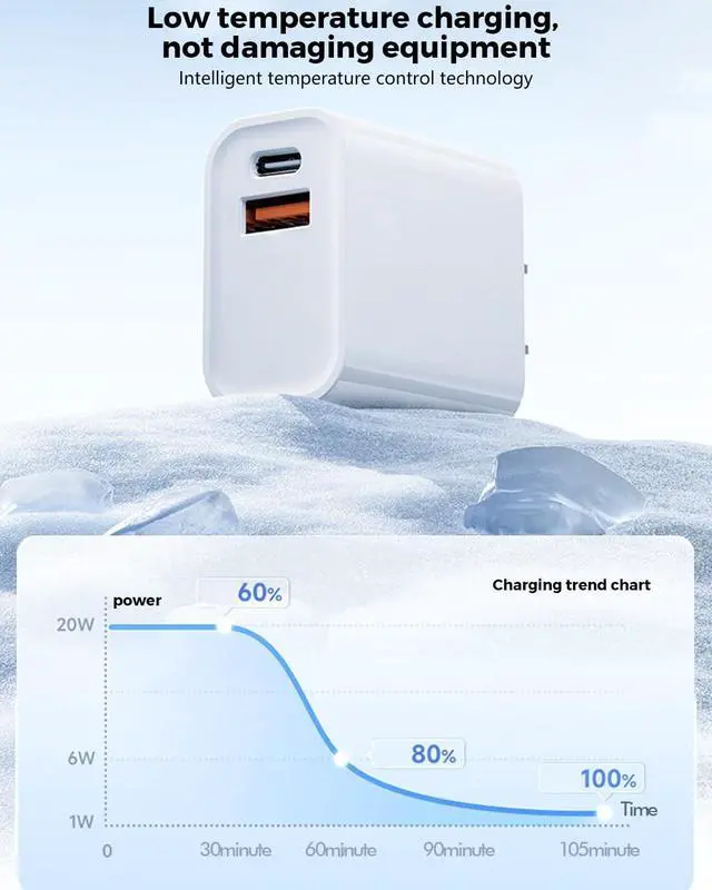 High-Speed Apple Dual Charging Block2 port integrated fast iphone charging blocks, connected to a device to obtain a maximum charge of 20W, enough to charge the iPhone 17/16 Pro Max at full speed. USB blocks speed can be three times faster than the other charger. It can quickly charge the iPhone 17/16 Pro Max from 0% to 60% in 30 minutes. When you connect two devices, usb power block will be efficiently distributed between ports to ensure optimal charging.