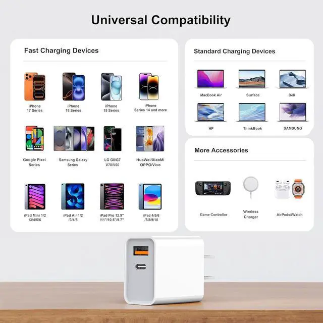 Pack Dual Port Charger: Compatible for iPhone 17/17 Pro/17 Pro Max/16/16 Pro/16 Pro Max/16 Plus/15/15 Pro/ 15 Pro Max/15 Plus/14/14 Plus/14 Pro/14 Pro Max/13/13 Pro Max/13 Pro. Block two in one - USB-A and USB-C ports to charge two devices simultaneously at high speed. Minimize waiting time and frees you from messy chargers with various interfaces
