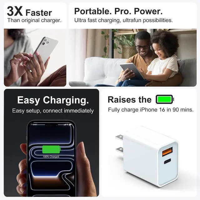High-Speed ChargerOffers fast and efficient charging up to 3X faster than a 5W charger. Charge your iPhone 16 up to 50% capacity in just 30 minutes with the original cable. (Cable not included, only 2 Chargers )