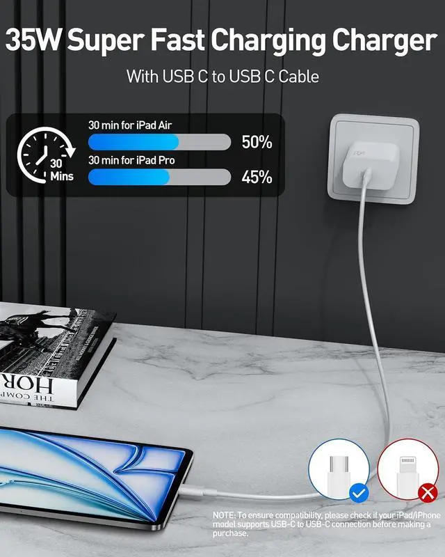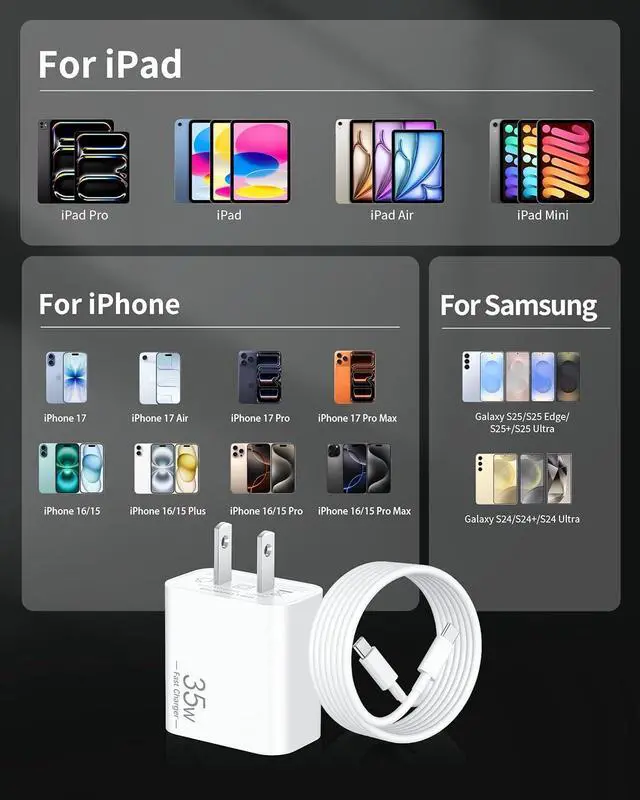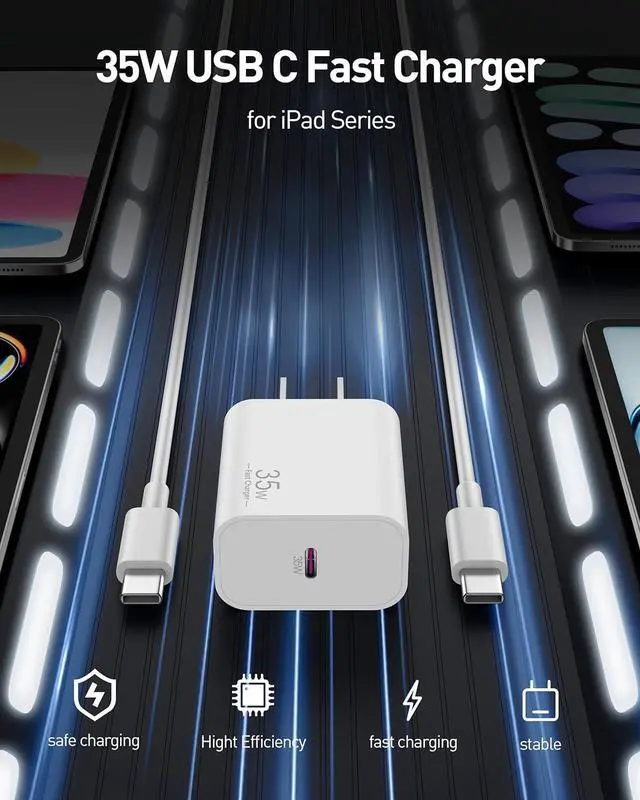 Widely Compatibility: 35W Fast USB C fast charger specially designed for the iPad Series. Compatible with iPad Pro 13/ 12.9 /11 inch 6th/5th/4th/3rd, iPad Air 13/11 inch M3 M2 Air 6th/5th, iPad Mini A17 Pro 2025 7th/6th, iPad 11th A16 2025 10th Generation, iPhone 17/17 Pro/17 Pro Max/Air/16/16 Plus/16 Pro/16 Pro Max/15/15 Pro/15 Pro Max, and also fast charge for Galaxy, Pixel, LG, Moto, Tablet, Android, and more USB-C devices.