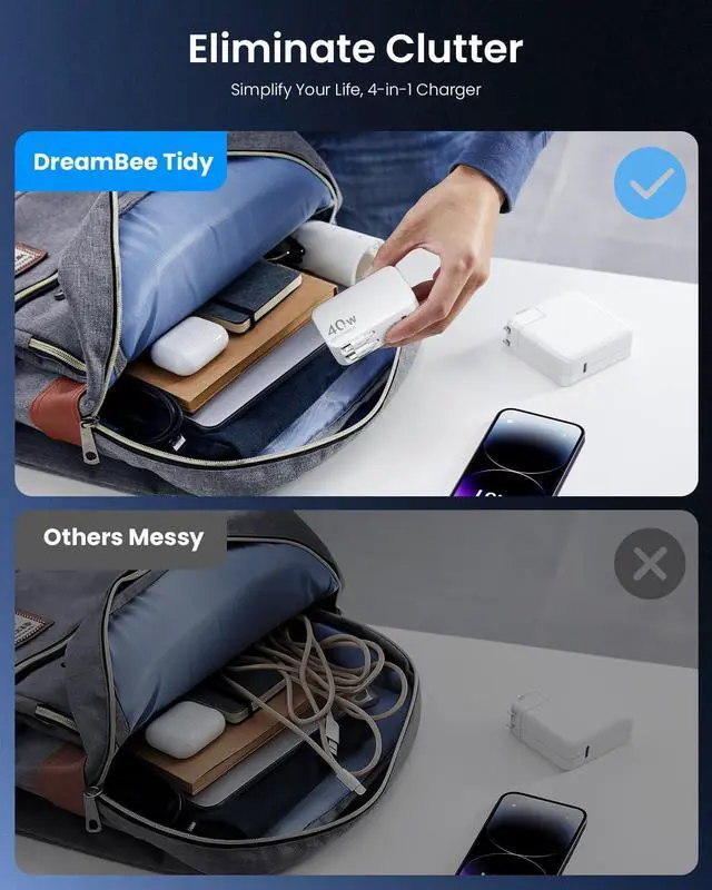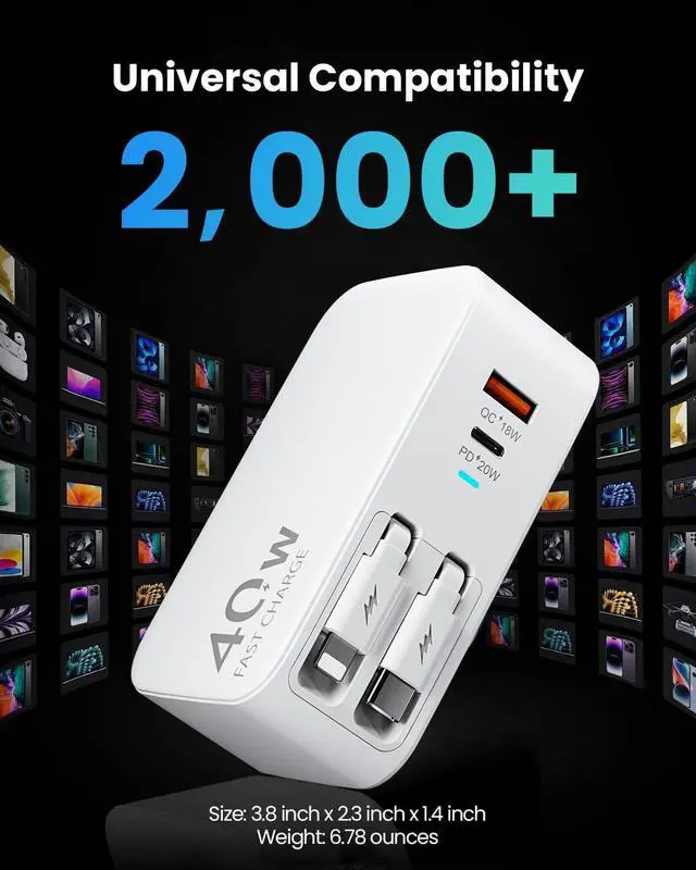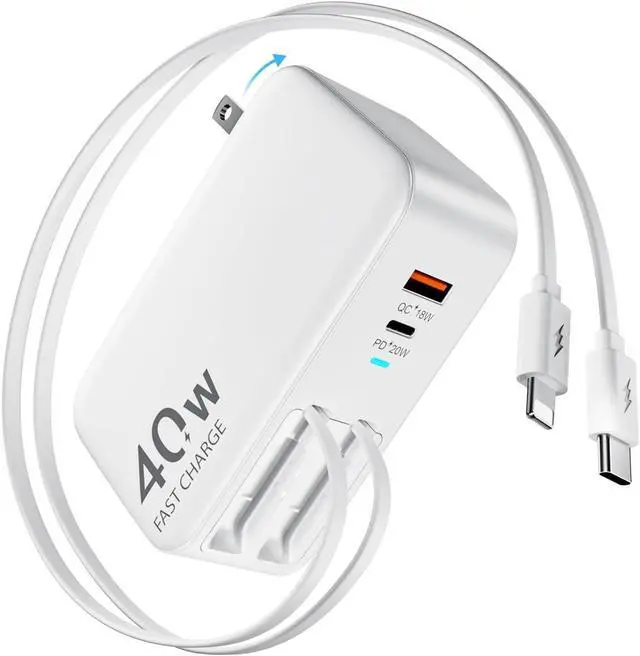 4-in-1 40W Fast Charging Retractable ChargerCharge up to 4 devices simultaneously with the DreamBee 40W retractable wall charger. Featuring dual USB ports and built-in 90cm retractable USB-C and Lightening cables, this retractable charger delivers up to 40W total outputideal for iPhone/iPad/Android phones/tablets, and more