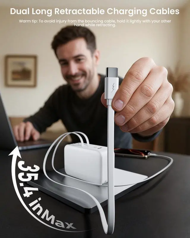 Dual 90cm Cables for Tangle-Free UseEnjoy clutter-free charging with built-in dual 90cm ( 35.5 in) retractable cablesUSB-C and Lightening. Just pull to extend, and pull again to retract. This retractable wall charger plug ensures clean storage and eliminates cable mess, whether at home, in the office, or on the go