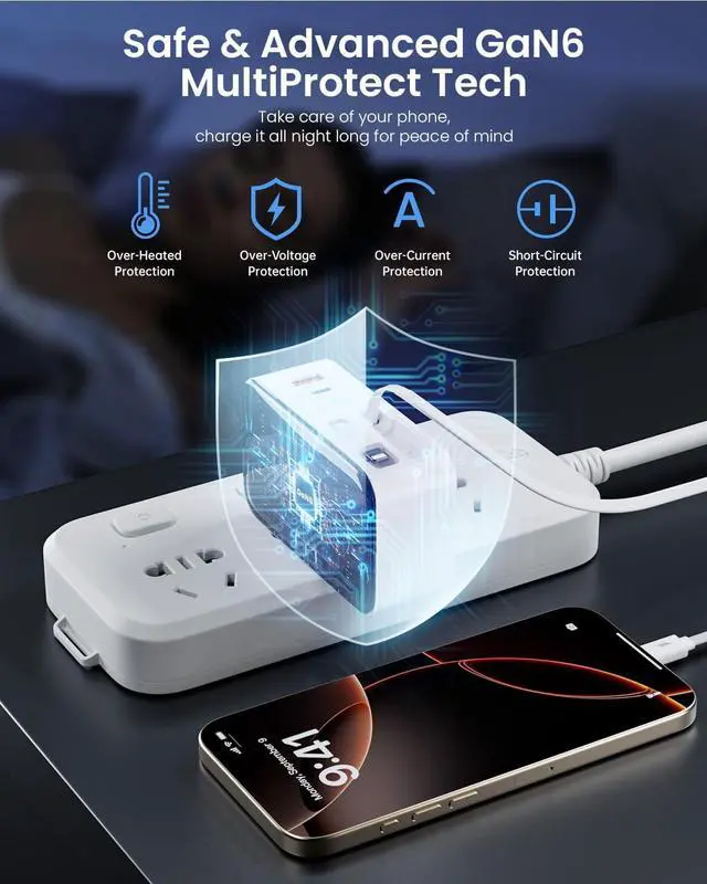 Safe & Powerful GaN6 TechEquipped with GaN6 fast charging technology and built-in safety chip, this retractable wall charger block ensures powerful yet safe performance. It features over-voltage, over-current, and over-temperature protection to safeguard your devices during every charge