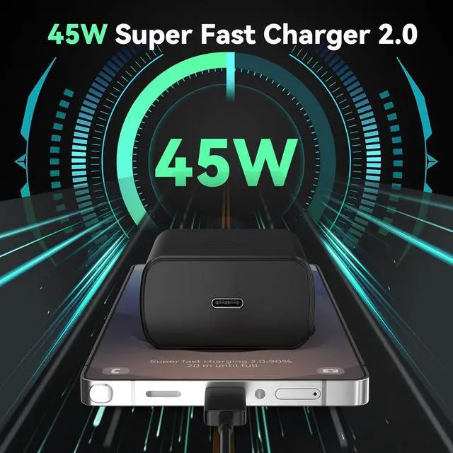 45W Samsung Super Fast Charger 2.045 watt USB C super fast charger type c charger with maximum power of 45W Super Fast Charge 2.0 capability uses Power Delivery technology to provide the most efficient charge possible. Super fast charge for Samsung Galaxy S25/S24 Ultra from 0% to 50% in just 20 min, more faster than other 25W/15W chargers.