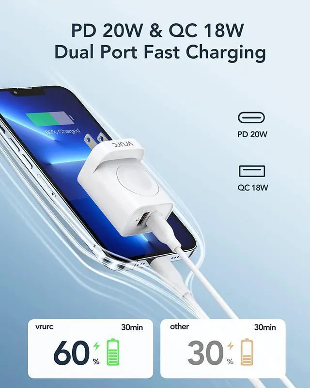 Multi Port Fast ChargerCharging block with dual port fast charging, 20W USB-C port and 18W USB port, supports fast charge for mostly PD QC 3.0 protocol devices, you can quick charger for you new iPhone or Samsung phones to 60% battery in 30 mins. meets your daily charging needs. also can use for charging three devices simultaneously.