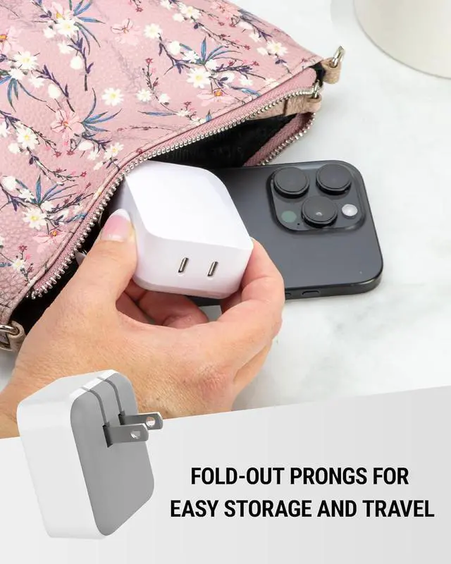 2 Port Design: Power up multiple devices simultaneously with our 65W Type C Charger. This versatile double usb c charger block intuitively allocates power between the two ports, delivering an optimal charge of 45W + 20W, or 57.5W + 7.5W. Whether you' re charging your laptop or your earbuds, this fast charging block is the ideal dual charging solution for all your devices.