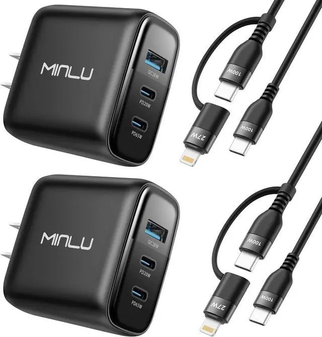 What You Get: You will get 2 pack PPS 65W 3-Port Power Adapter, 2 pack 100W 6 ft 2-in-1 USB-C to USBC/Lightning fast charging cable, and our worry-free 12-month warranty, and friendly customer service.