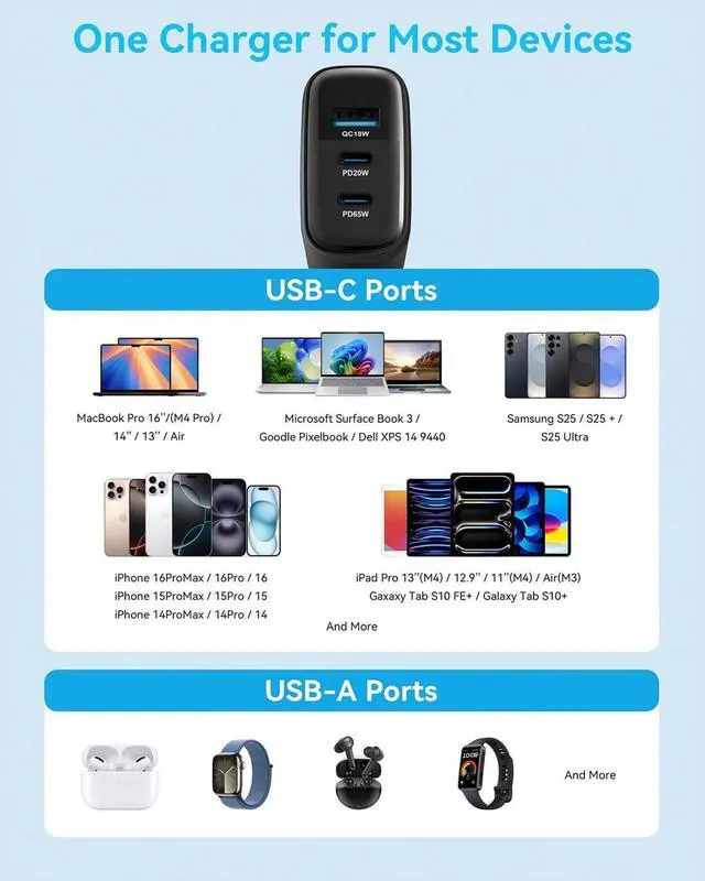 High-Speed Charging: Connect a single device to get a 65W max chargethats enough to power up a 2022 MacBook Air 13.6 at full speed. And when you connect three devices, power will be distributed efficiently between ports to ensure you get the best charge.