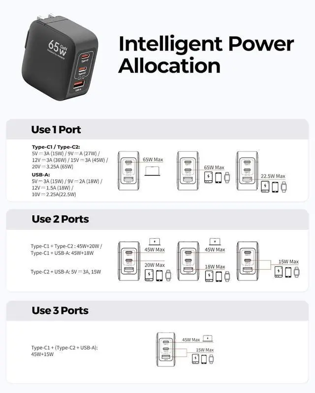 Say goodbye to your old chargers. The MUNBYN 65W USB-C Charger features 2 USB-C ports and 1 USB-A port, letting you power your phone, tablet, and USB-C notebook simultaneously
