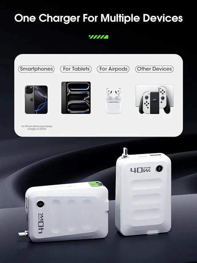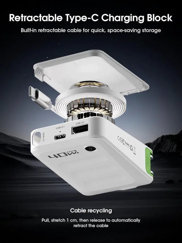 Retractable Usbc Charger Block: Simplify travel with this 40W charger and retractable 33.5 Type-C cable. Pull to extend, retract to store ideal for desktops, nightstands, and travel. Its compact, foldable design fits easily in bags without scratching, making it a single, convenient solution for all your charging needs.