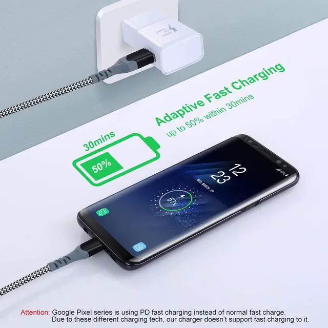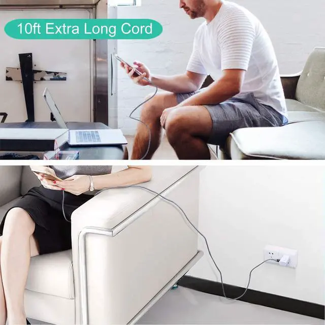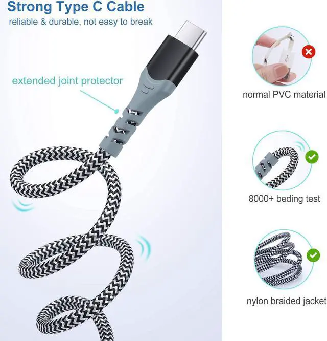 10Ft USB-C Cable Included: Comes with a 10-feet USB-C cable which is long enough to let you lie on the bed, stay on the sofa during charging. The nylon braided cover makes it tangle-free and durable. Prolonged SR protector extends its bending lifespan. This USB C charger supports fast charging, its a great partner of adaptive fast charger. The speed of data transfer can be up to 480Mb/s, without any error message, helps you work efficiently.