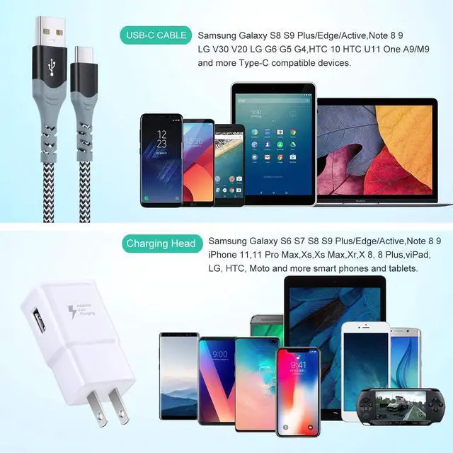 C devices like: compatible with Galaxy S25/S24/S23 Ultra/S23+/S23/S22 Ultra/S22+/S22/S21FE/S21/S20/S10/S10e/S10+/S9/S9 Plus/S8/S8 Plus, Note 10/10+ 8/9, A13 A03s A53 A15 A14 A23 and More type c phones. The charging block also works with other non-quick charge devices by using the adaptive cable. (The attached cord is USB Type C Cable)